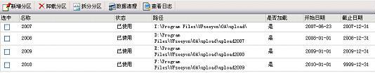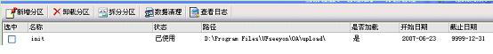 举例:今天是2007-9-18,下午3点时无法上传附件,发现存储I盘空间已满,服务器G盘有剩余空间,那么我们进行拆分分区操作,拆分时间点设为2007-9-17,路径为G:\upload2007,然后将I:\Program Files\UFseeyon\OA\upload\upload2007目录下今天的2007\9\18文件夹拷到G盘upload2007\2007\9\18目录下即可。