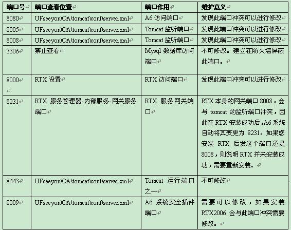 3,A6系统占用端口一览表:当端口冲突时可进行调整,另外有些单位利用防火墙对端口进行严格管理,使用中的端口允许放开权限,其他均不对外开放,那么您可依据此表进行调试。