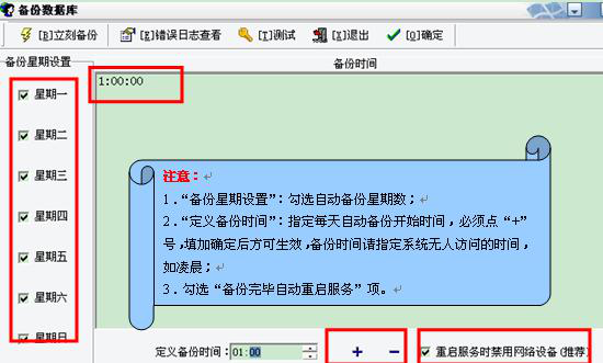 在小地球上点右键选择“备份数据库”,在“定义备份时间”点击“+” 添加时间,“备份星期设置中”勾选哪天进行备份。注意添加的备份时间为24小时制,并尽量设置在无人使用OA时。