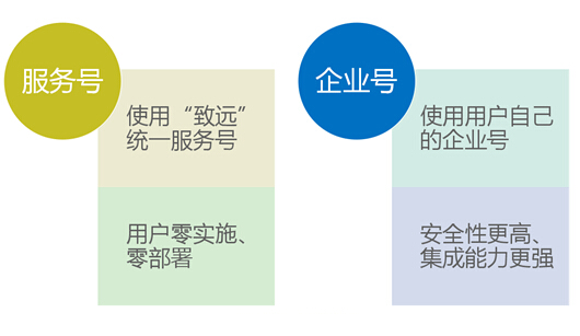 致远微协同使用了“混合云”的模式,可以基于微信的“服务号”、“企业号”,针对不用类型、不同需求的企业提供不同的使用模式。