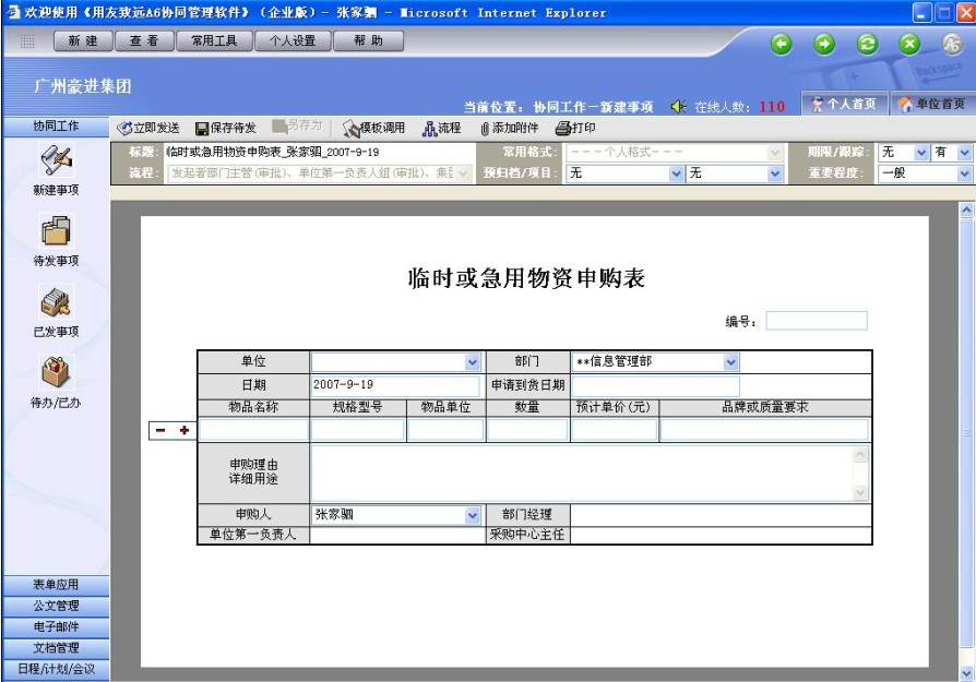 此外,豪进集团属制造型企业,上游零配件供应商数量多、采购量大。采购部经常有大量采购审批单据等待处理。A6上线以后,如果出现临时或急用物资的采购,可通过填写“临时或急用物资申购表”,提交给采购部门审批。不仅可以减少生产、采购等部门的工作量,大大提高审批处理效率,而且这些采购文档可以归档保存,方便日后查询统计。同时,无纸化表单,能够节约企业的办公费用,也为绿色豪进的建设贡献一份力量。