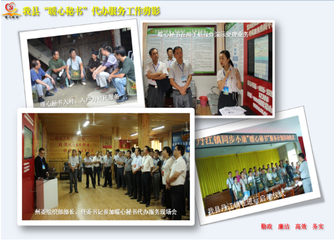 “暖心秘书” 代办服务是县政府为更好的方便于民,服务于民,提高办事效率,进一步完善基层社会管理的服务体系,打通服务群众“最后一公里”的便民服务工程。重点应用协同M1打造手机终端受理业务平台。通过建立县、乡、村三级“暖心秘书”服务组织构架,以“便民、规范、廉洁、高效”的服务宗旨,全方位为人民群众提供方便、快捷的服务。