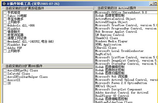 如下图所示,维护工具自动搜索出与IE绑定的工具软件,建议您对左上角(IE扩展插件)全部勾选,然后点击下方的“卸载插件”,再点击“重新注册DLL”按钮,系统将自动将其与IE的绑定卸载干净。
