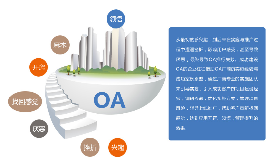 虽然OA市场门槛要求不高,但是令人遗憾的是OA应用失败的例子笔笔皆是,阻碍了企业的效率提升、管理落地、战略达成。推广方式不当,需求不符,问题得不到及时处理等都会导致项目风险。OA应用的过程用户情绪变化如下图: