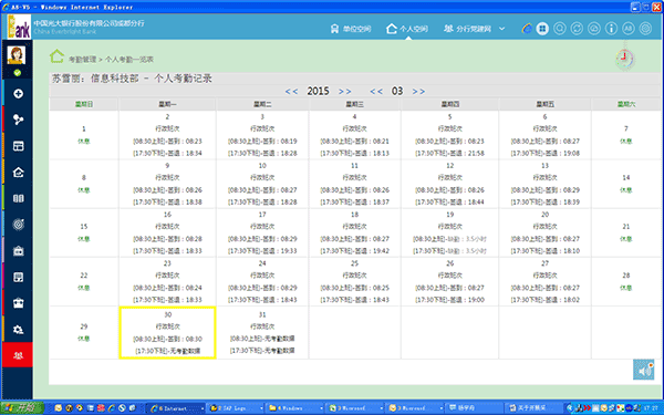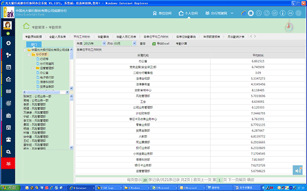 光大银行成都分行的管理特点是网点多、考勤管理十分严格。2015 年, 在原有协同应用基础上,通过使用致远 V5 业务生成器搭建了异地联网考 勤系统,实现了 36 个网点的实时异地考勤。成都分行因此成为光大银行 全行第一个可以实时准确出具全员考勤报表的分行。